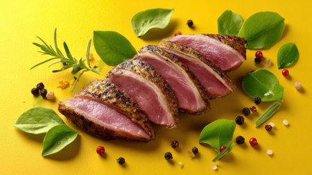 Sliced duck breast is arranged neatly, surrounded by green herbs and colorful peppercorns on a bright yellow surface. This presentation highlights a gourmet dish ideal for food enthusiasts.