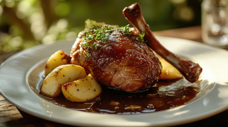 Closeup of a roasted duck confit leg paired with baked apple and gravy on a white plate, illuminated by soft sunlight, creating a warm and inviting summer dining scene