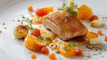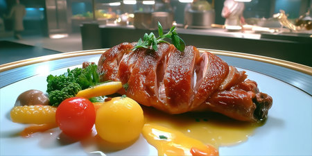 Roasted chicken leg with glazed sauce and seasonal vegetables on elegant plate