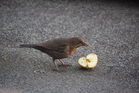 Blackbird with apple in its beak on the ground. Turdus merula