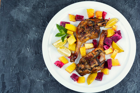 Duck recipes, tasty roasted duck legs with pitaya or dragon fruit and pineapple. Copy space.