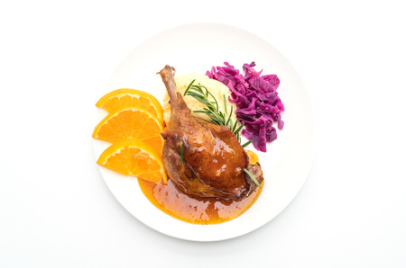 roasted duck leg steak with orange sauce isolated on white background