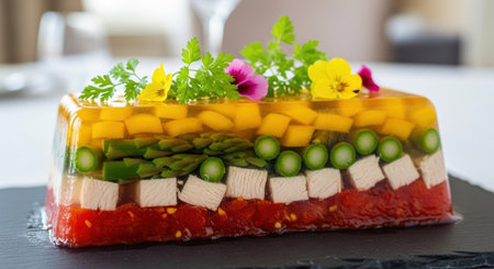 Colorful layered terrine with tomato, chicken, asparagus, peas, and mango in gelatin, garnished with fresh herbs and edible flowers, served on a black plate.