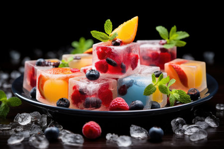 Vibrant jelly dessert with neon colors on a sleek black surface illuminated softly