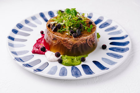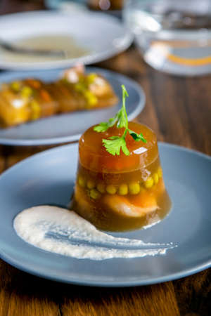 Aspic. Dish of chilled meat broth with meat and vegetables. Traditional national dish of Ukrainian cuisine. Holiday food. Jellied beef. For food blog, restaurant, cafe, menu, cookbook