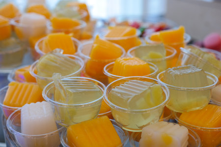 Various colored jellies in plastic cups on buffet