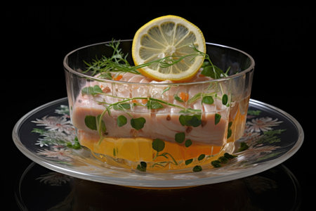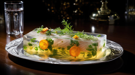 Fish in aspic with. Fish in jelly. Fish with gelatin. Generative AI