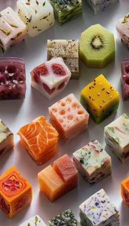 An array of colorful fruit jellies, including raspberry, lemon, and orange flavors, arranged in a repeating geometric pattern on a soft pastel yellow surface. The composition is illuminated by gentle studio lighting, enhancing the vibrant hues and creating a cheerful atmosphere. Ideal for culinary blogs, recipe cards, or as a decorative element in kitchen designs. AI-generated illustration.