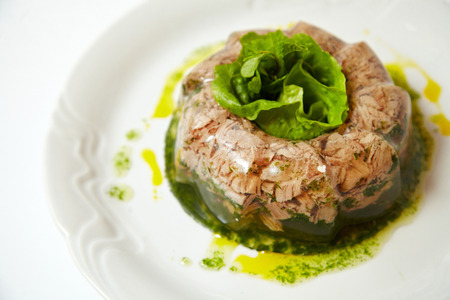 Aspic meat on a plate. Beef jelly. Russian food aspic