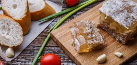 Homemade jelly meat with mustard, bread, tomatoes and garlic on the table. Holodets