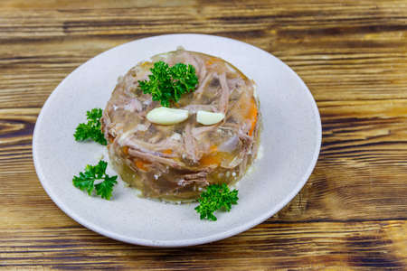 Meat aspic in a plate on a wooden table. Traditional russian dish