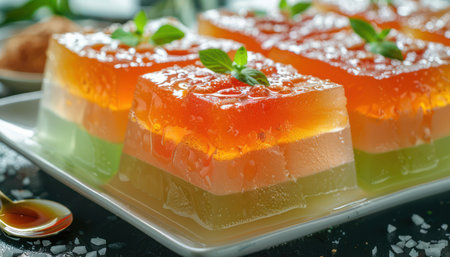 This visually stunning image features intricately designed gelatin desserts adorned with floral patterns, served on elegant plates. Bright colors and artistic flair enhance the charm of these gourmet treats.