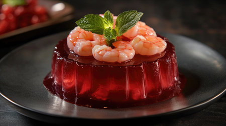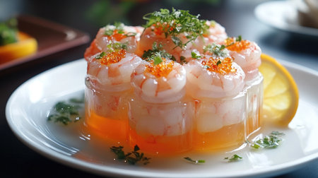 A beautifully presented plate of steamed shrimp in a translucent jelly, garnished with fresh herbs and citrus slices, showcasing vibrant colors and textures