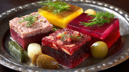 Assorted traditional aspic dishes are elegantly served on a silver platter.