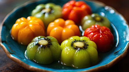 This visually stunning image showcases a variety of colorful jelly desserts shaped like flowers, elegantly displayed on a blue ceramic plate.