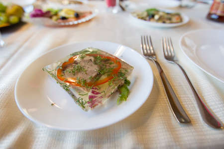 Aspic from meat decorated with parsley on a festive table