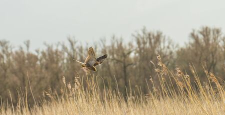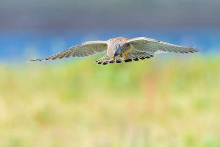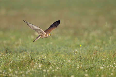 Common Kestrel (Falco innunculus) flying in the meadows in the Netherlands