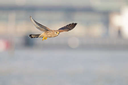 Common Kestrel (Falco tinnunculus) Male Bird Flying against Bright Background. Small Raptor in Extremadura, Spain. Wildlife Scene of Nature in Europe.