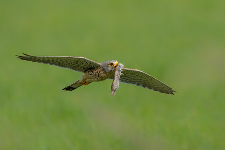 Common Kestrel (Falco innunculus) flying with a prey to feed the chiks in the meadows in the Netherlands