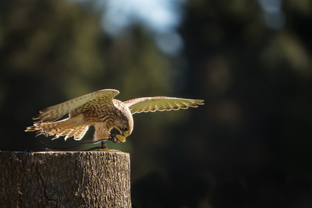 A common kestrel (Falco tinnunculus) eating a mouse.