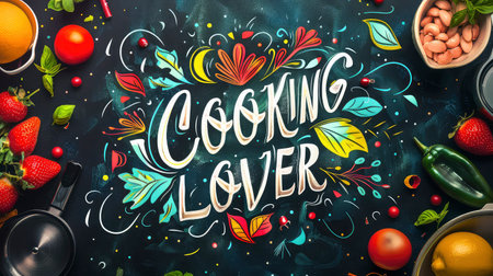 Cooking Lover Lettering with Fruits and Vegetables on Chalkboard Background.
