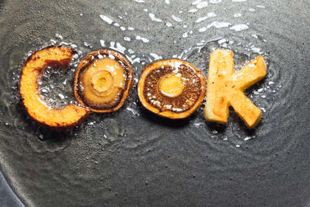 fried vegetables in the form of letters, the word cook from products is fried in a frying pan on oil