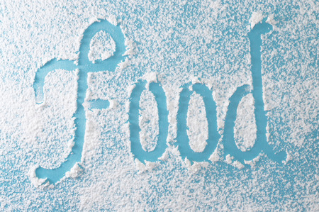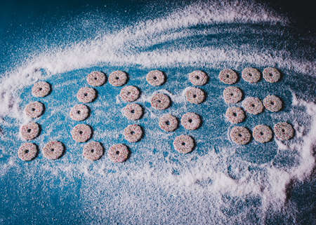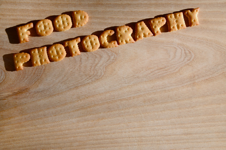 Food photography. Text from the salty crackers as printed English letters that lie on a wooden chopping board. Message, lined with edible letters