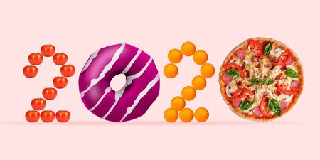 2020 made from unhealthy food on coral background. Pink glazed donut and pizza's slices, tomatos and oranges. Copyspace, nutrition and delicious eating. New Year's and Merry Christmas concept.
