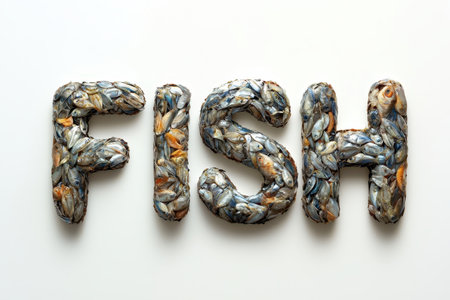 A creative design features the word fish crafted entirely from various small fish, isolated against a clean white surface. This artwork emphasizes marine life and artistic expression.