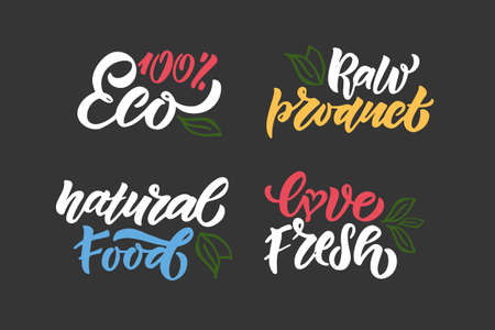 Hand sketched badges and labels with vegetarian, vegan, raw, eco, bio, natural, fresh, gluten and GMO free food diet design. Organic food elements set for product, cafe, restaurant and organic product packaging.