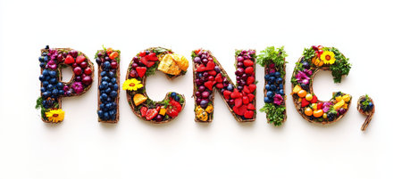 Word Picnic Spelled Out In An Arrangement Of Fruits, Vegetables, Herbs, Leaves, Stems And Flowers.