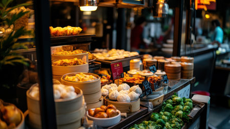 A Delicious dim sum display with various dumplings and buns