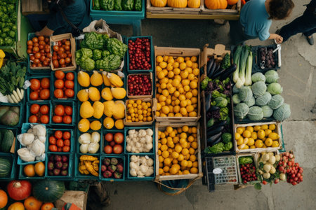 Fresh organic produce variety sold by market vendor in city street generated by artificial intelligence