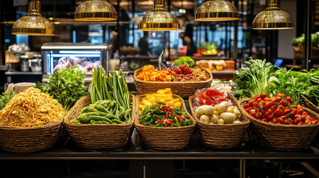 A vibrant assortment of fresh vegetables and herbs displayed in woven baskets at a modern market, emphasizing healthy eating and culinary creativity.