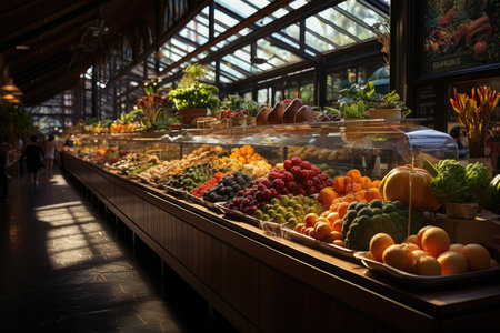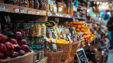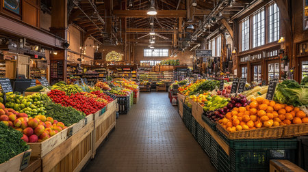 A bustling market showcases an array of colorful fruits, vegetables, and various food items. Shoppers explore the aisles, creating a sense of activity and community. The scene is illuminated by natural and artificial lighting, highlighting the textures and variety of the goods. This image may be suitable for illustrating food retail or culinary topics.
