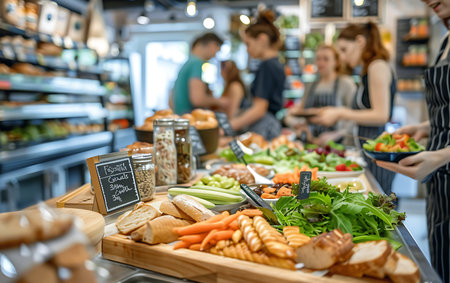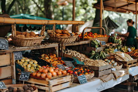 A bustling marketplace showcases a variety of fresh produce, baked goods, and prepared foods. The scene is filled with people browsing and interacting. The composition features a wide perspective, with natural lighting illuminating the diverse array of products. This image is suitable for illustrating themes related to food, commerce, and daily life.
