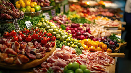 Explore a vibrant showcase full of fresh vegetables, meats, and preserved foods at a store in Bologna city. Perfectly arranged, inviting and diverse food items are visible.
