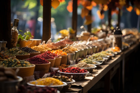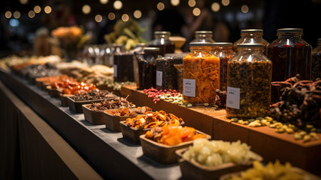 A bustling market stall featuring a colorful array of spices and herbs in glass jars, capturing the vibrant atmosphere of a traditional market. Ideal for themes related to cooking, food markets, and spices.