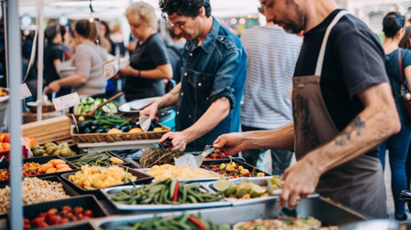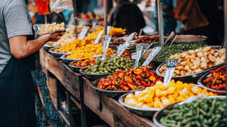 A vibrant street food stall at a local market, under natural daylight, shot with a wide-angle lens, celebrating the diversity of global cuisine