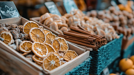 A charming market display featuring vibrant dried orange slices and fragrant cinnamon sticks, accompanied by fresh citrus fruits. Ideal for food-related themes.