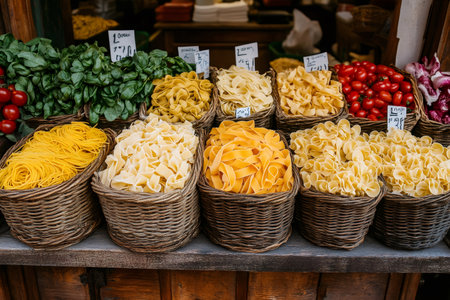 Wicker baskets overflowing with colorful pasta and fresh basil leaves create an enticing display at an Italian market