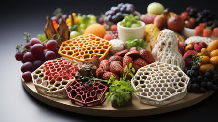 A large table with a variety of fruits and vegetables arranged in different patterns, AI