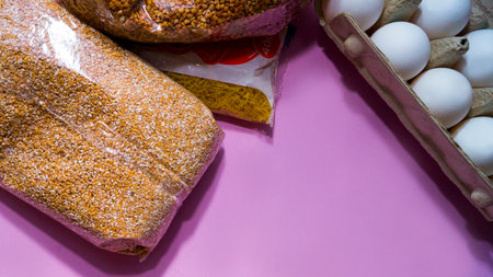 Food supply crisis food stock quarantine period isolation on a pink background. Buckwheat, eggs, pasta. Food Delivery, Donation, Coronavirus Quarantine. Copy space. Place for text.