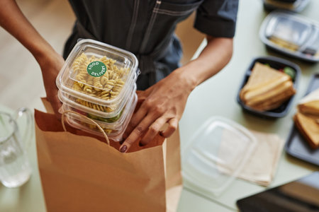 Closeup of black young woman packing food delivery order into paper bag, copy space