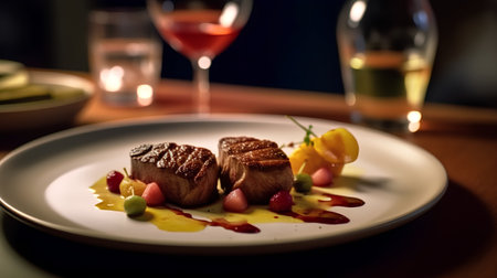 Elegant luxury dining with gourmet cuisine and wine in a cozy restaurant. Culinary delight captured in ambient lighting. Food catering and English cuisine