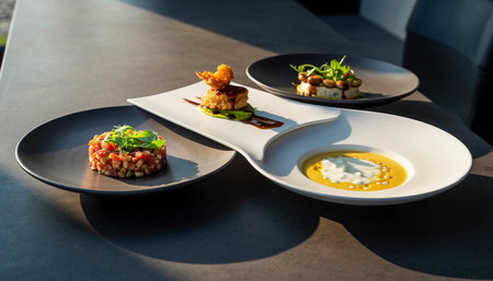 A beautiful arrangement of gourmet dishes displayed elegantly on dishes, showcasing vibrant ingredients and artistic culinary presentations in a modern style.