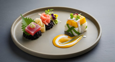 A beautifully presented plate of gourmet sushi featuring fresh tuna rolls and mango rice with artistic sauce garnishes. The fine dining dish highlights precision and culinary art in a modern setting.
