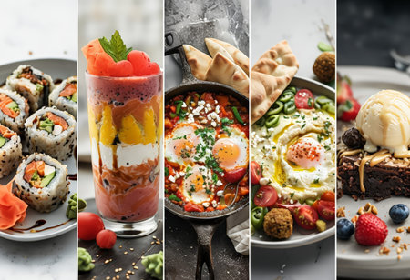 A collage of five food-related images shows sushi rolls with avocado and salmon toppings; layered dessert or smoothie containing yogurt and fruits in a glass container; savory dish