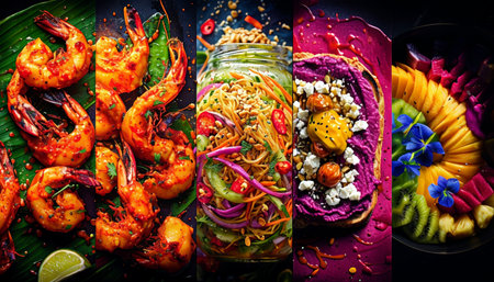 A vibrant collage of four images displays colorful food items: shrimp in red sauce with green leaves, noodles with vegetables, purple roti topped with nuts and sauces, and a fruit