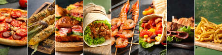 Collage of different photos of delicious food. A set of images with edible dishes